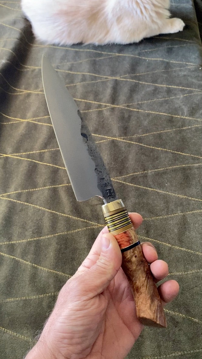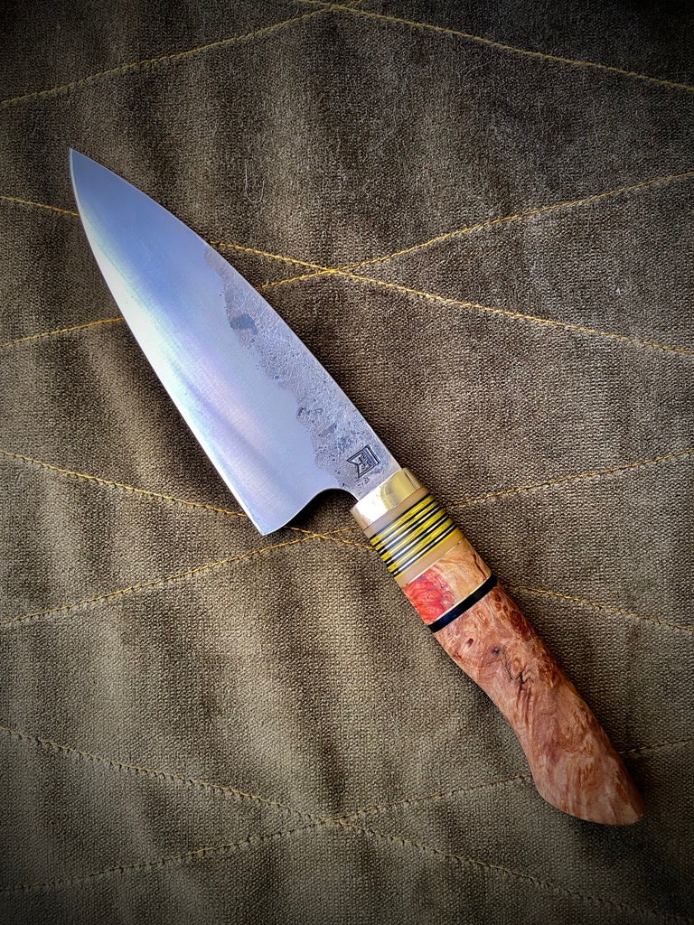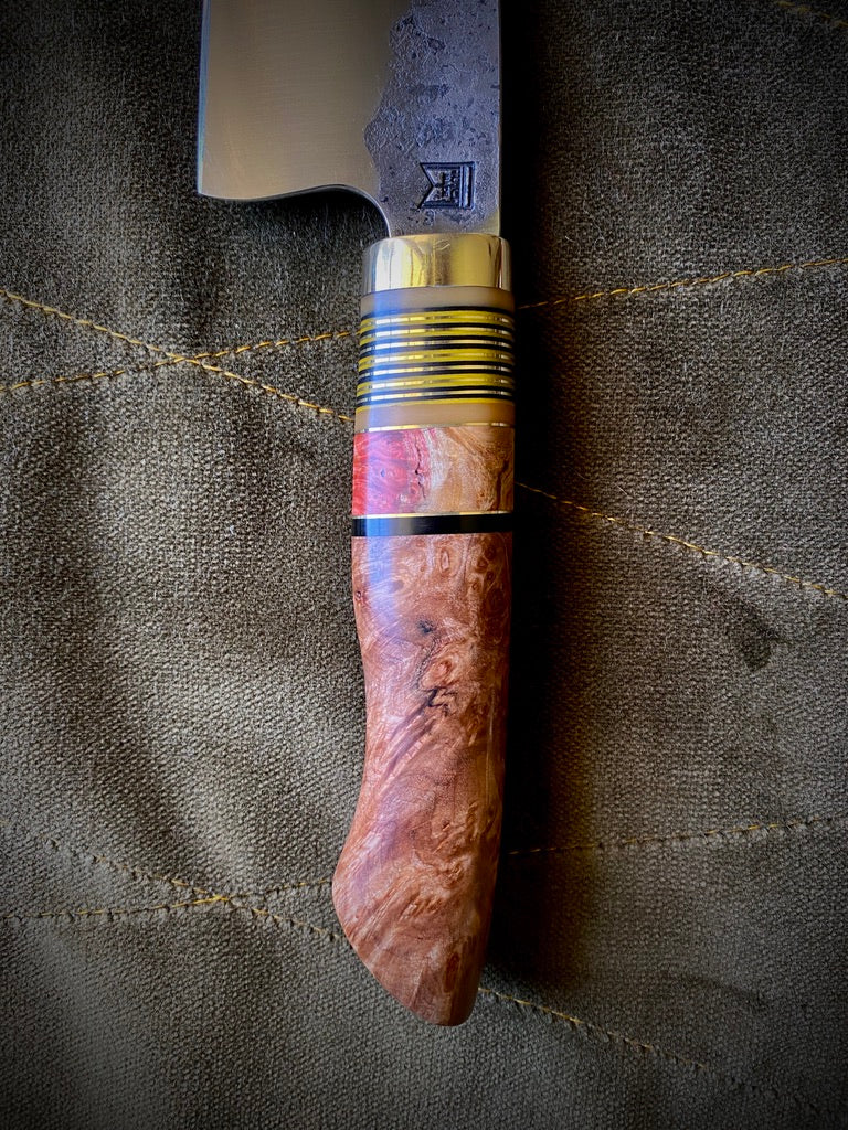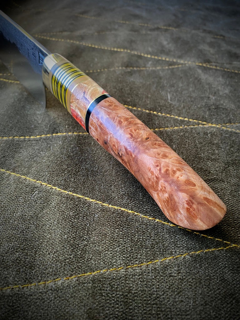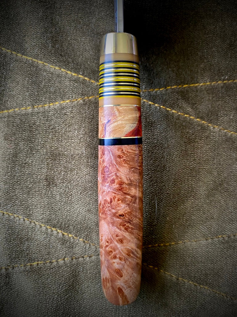 Curly maple handle with box elder burl spacer