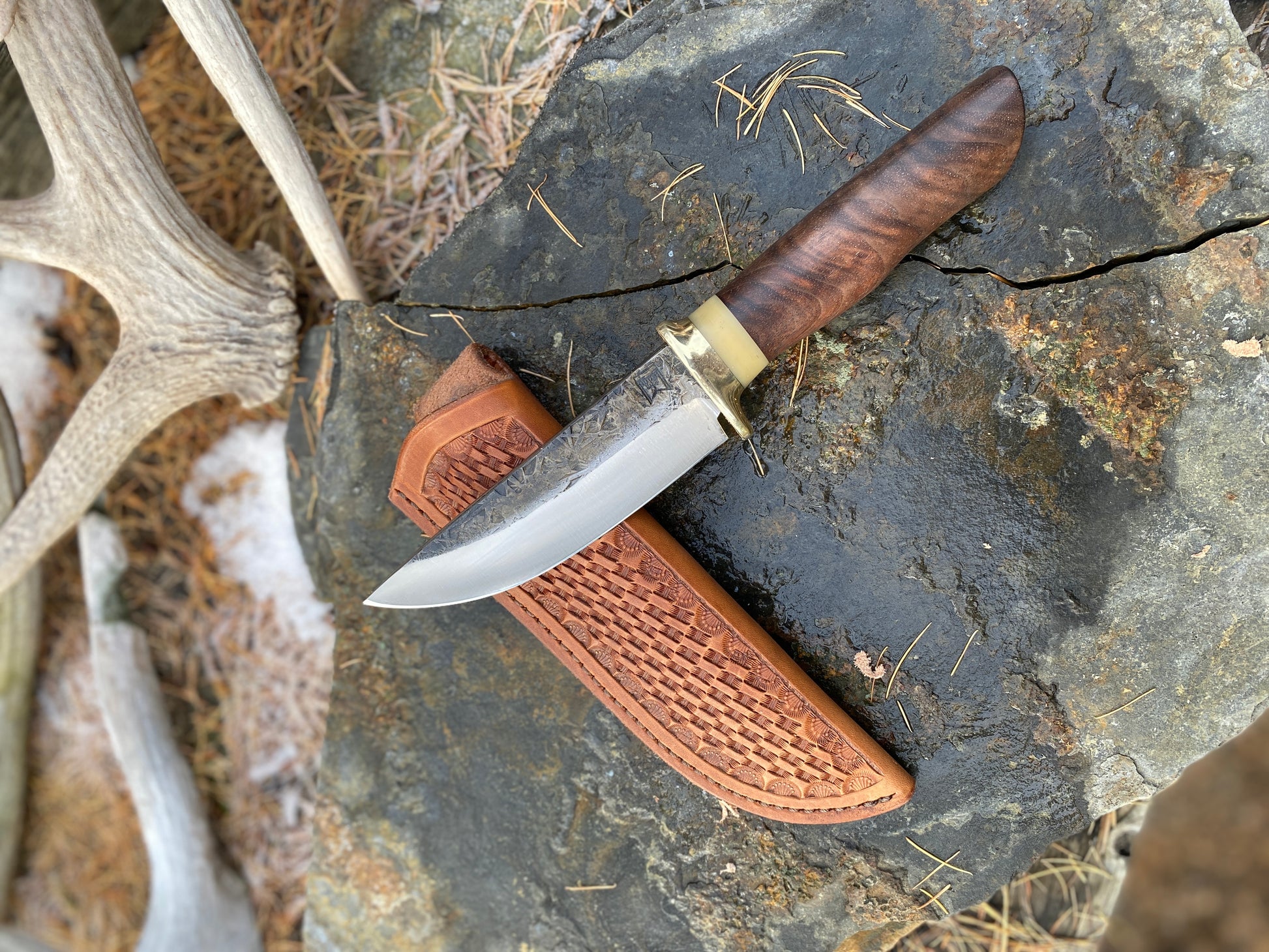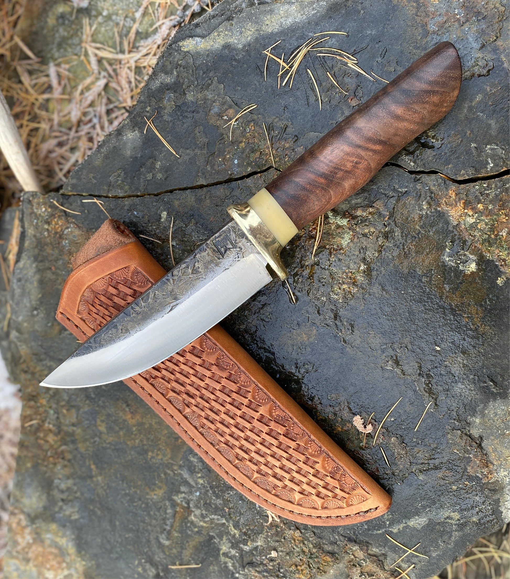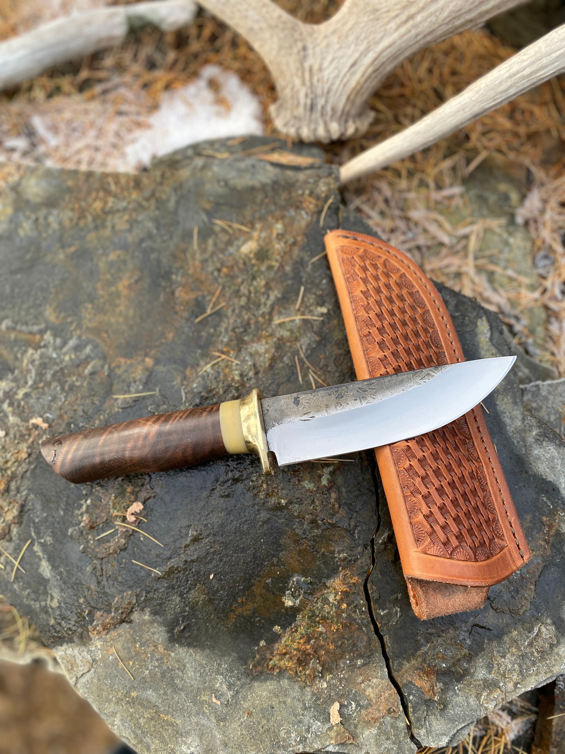 hand forged field knife with brass guard and stabilized curly walnut handle. Comes with hand tooled sheath made from Herman oak leather.