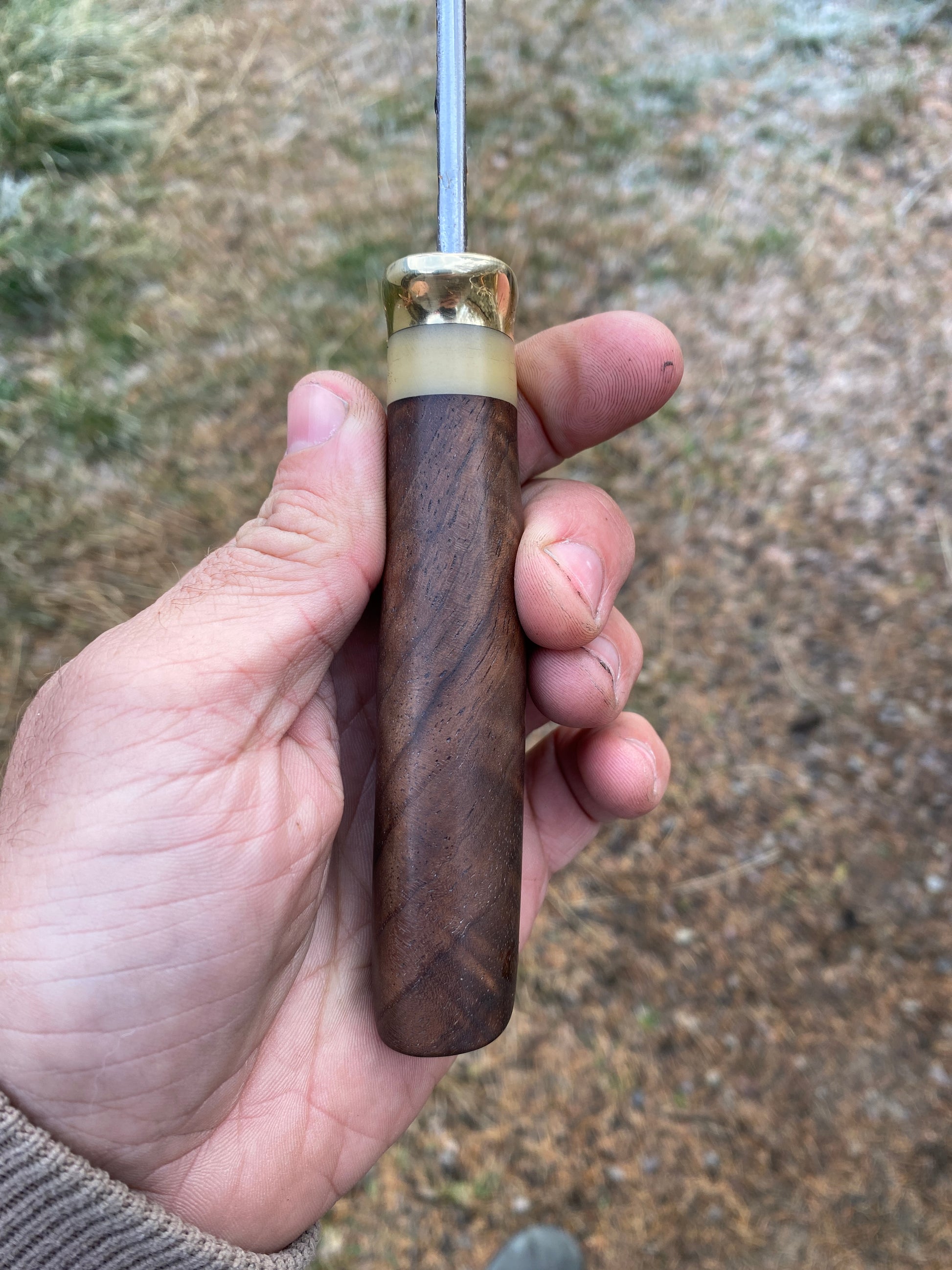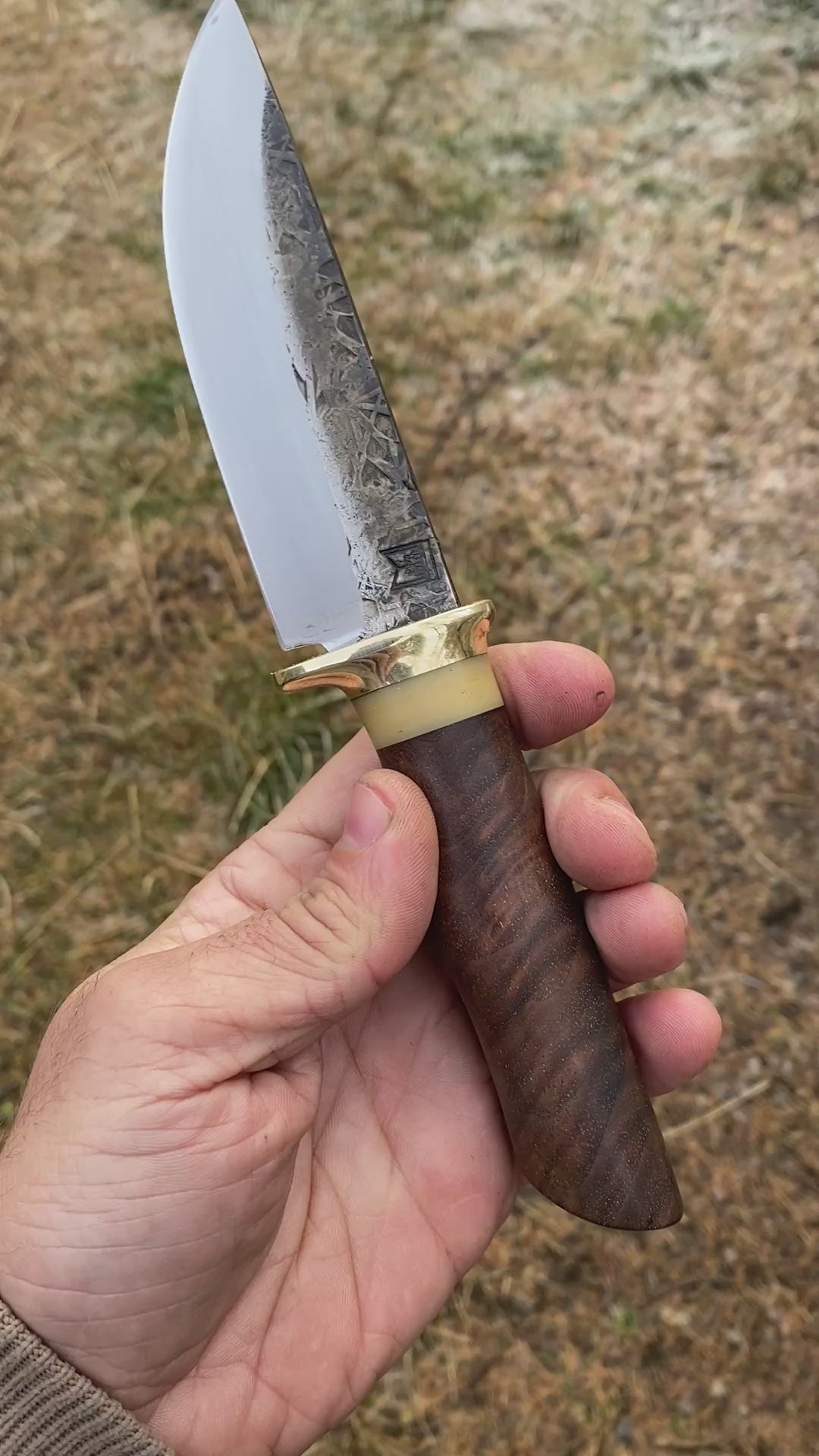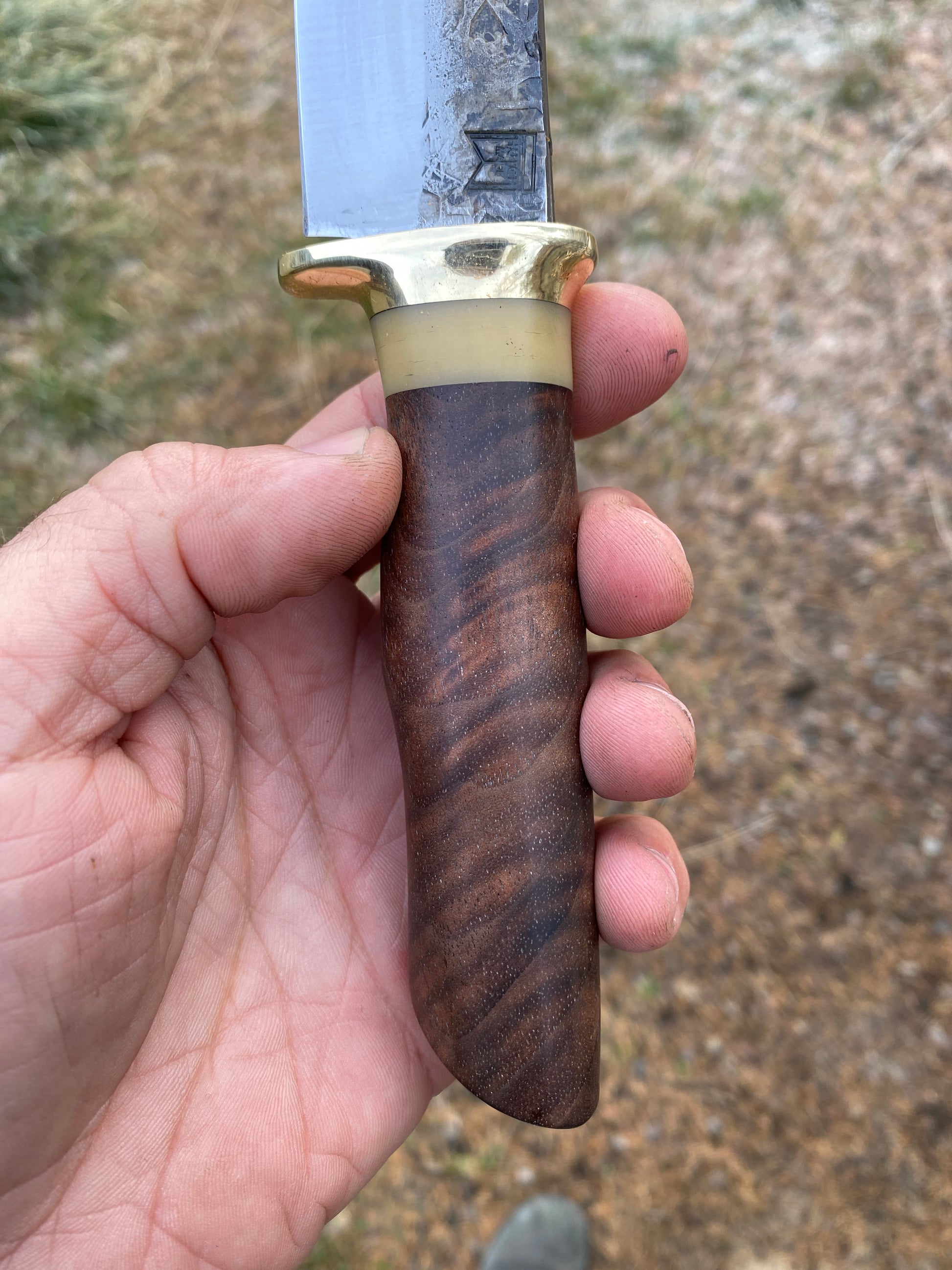 hand forged field knife with brass guard and stabilized curly walnut handle. Comes with hand tooled sheath made from Herman oak leather.