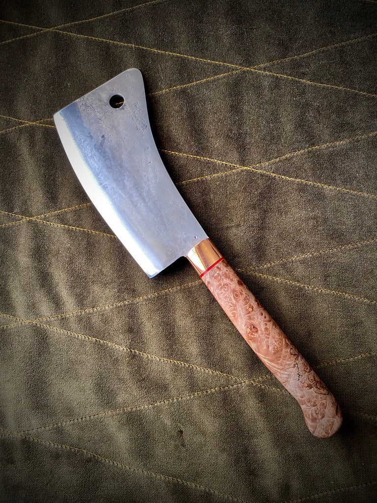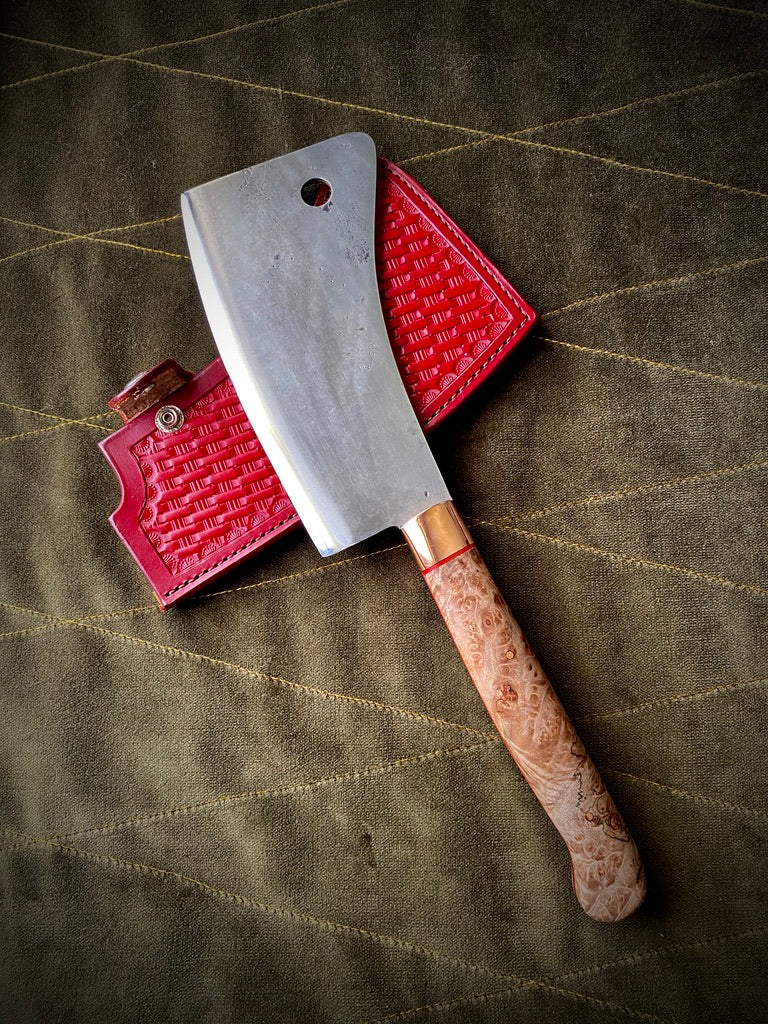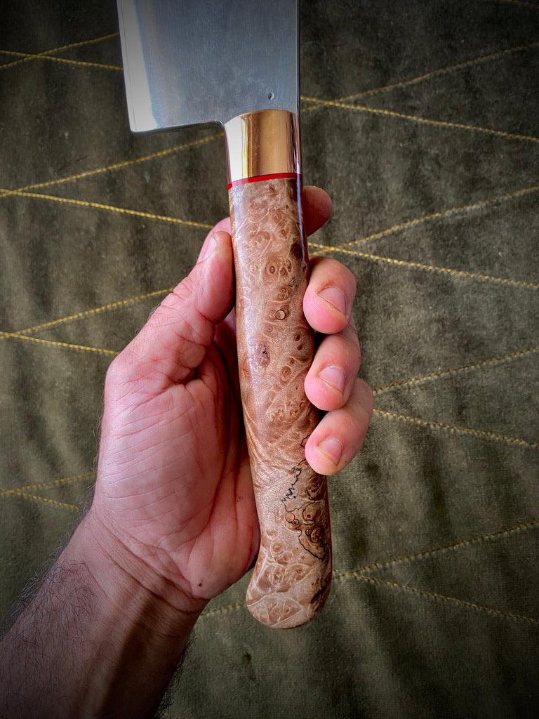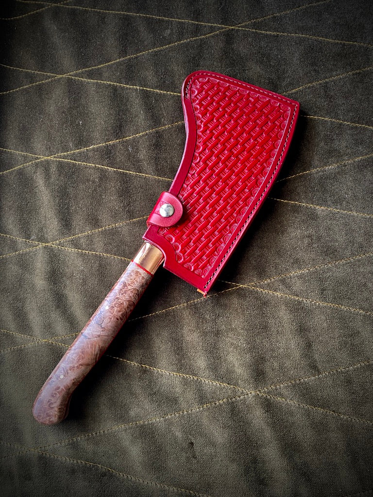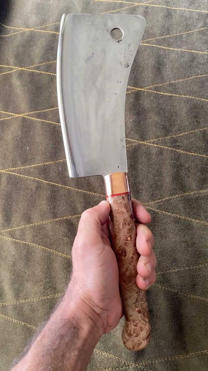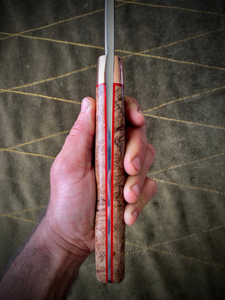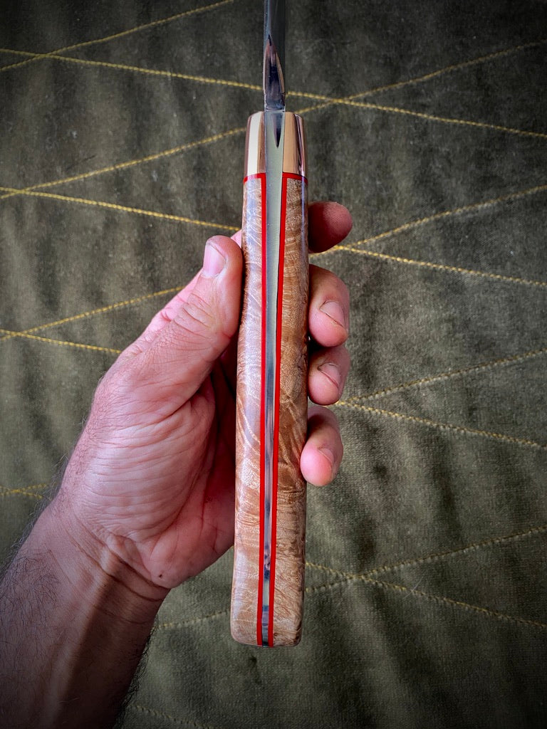Stabilized maple burl handle with red liners and copper bolster