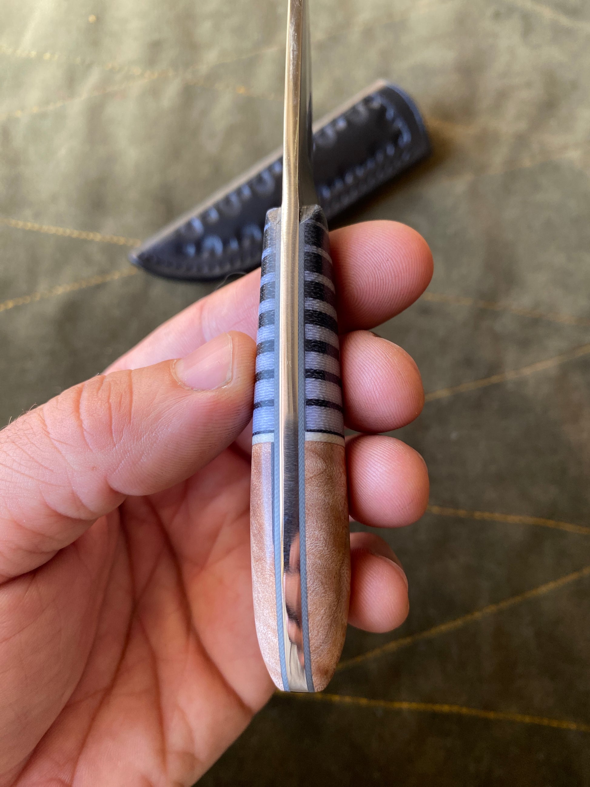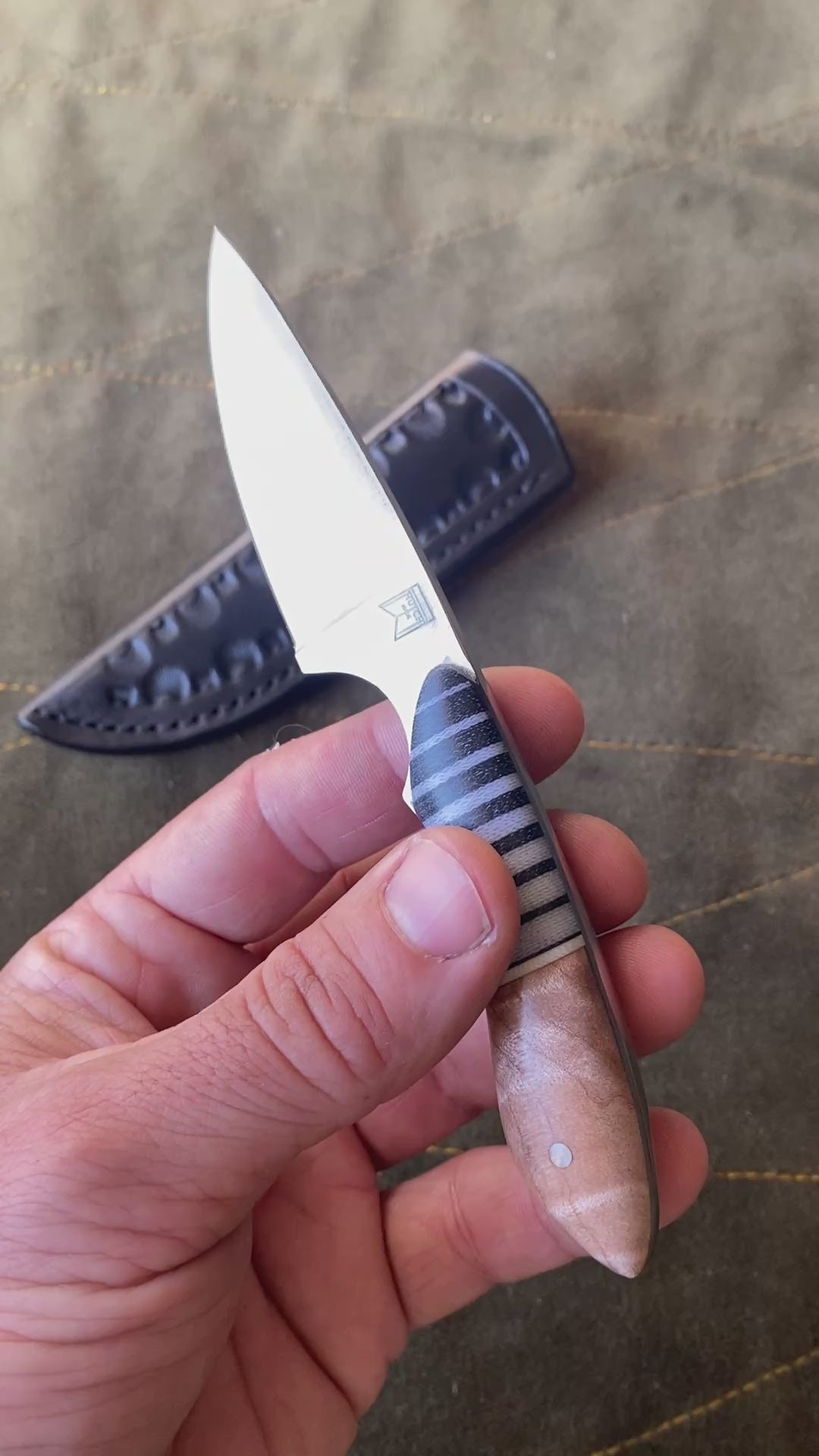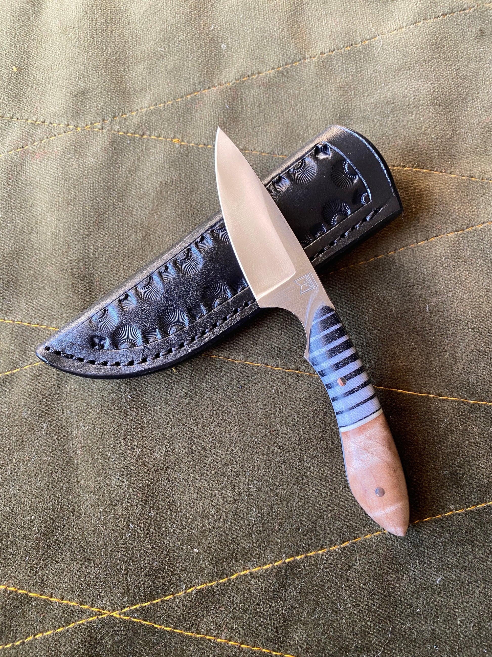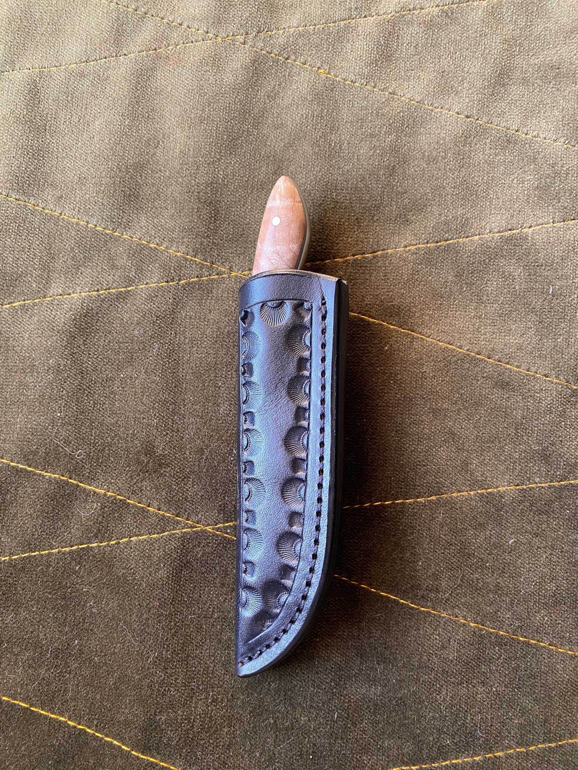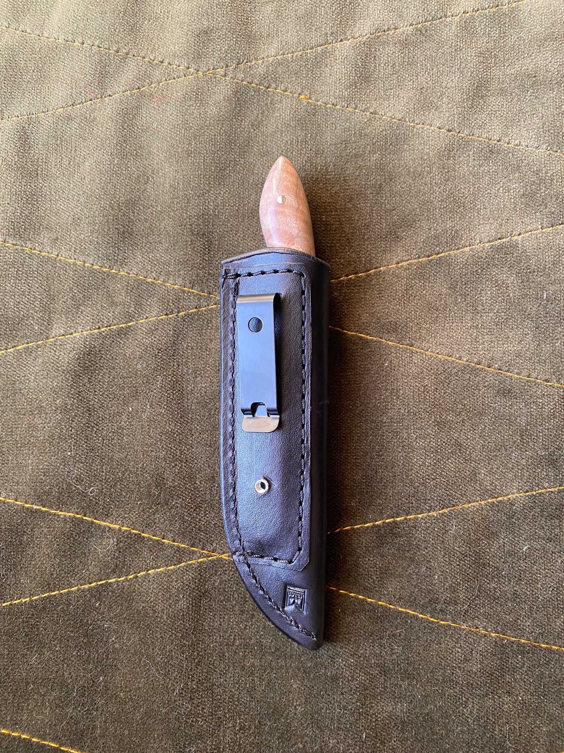 comes with custom tooled leather sheath for inside the front pocket with clip