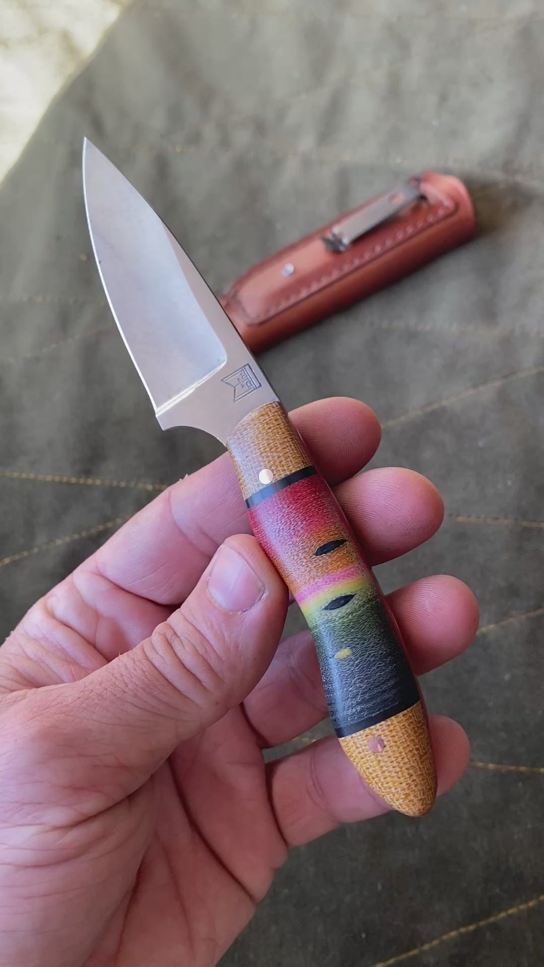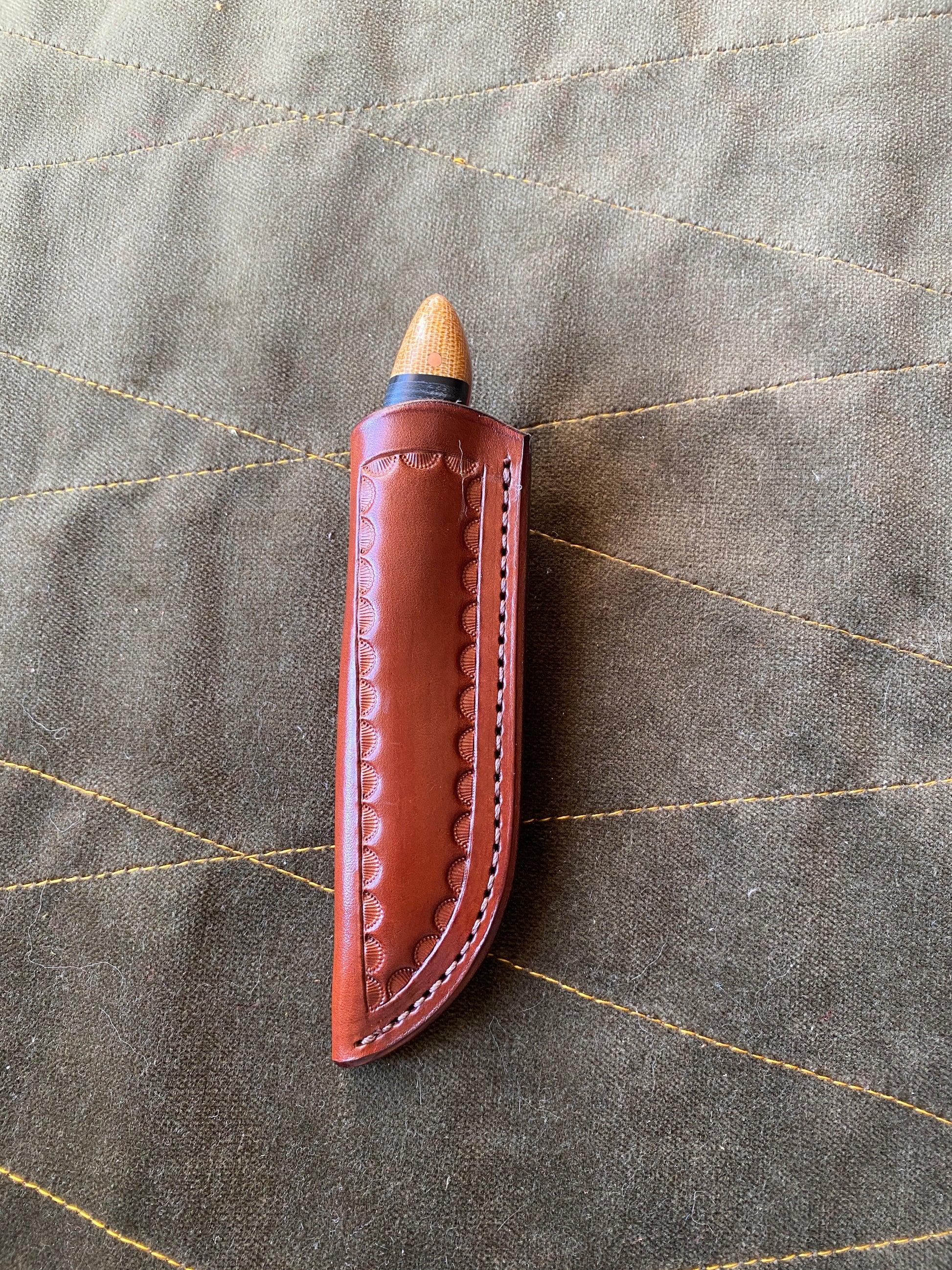 comes with custom tooled leather sheath for inside the front pocket with clip